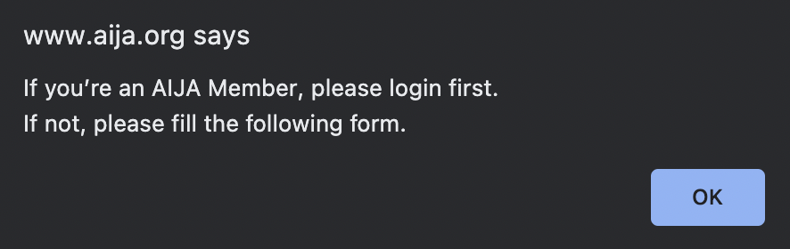 If you are not an AIJA member and the below message pops up in your browser when accesing the registration form, please click 'OK' and procced with filling in the form.